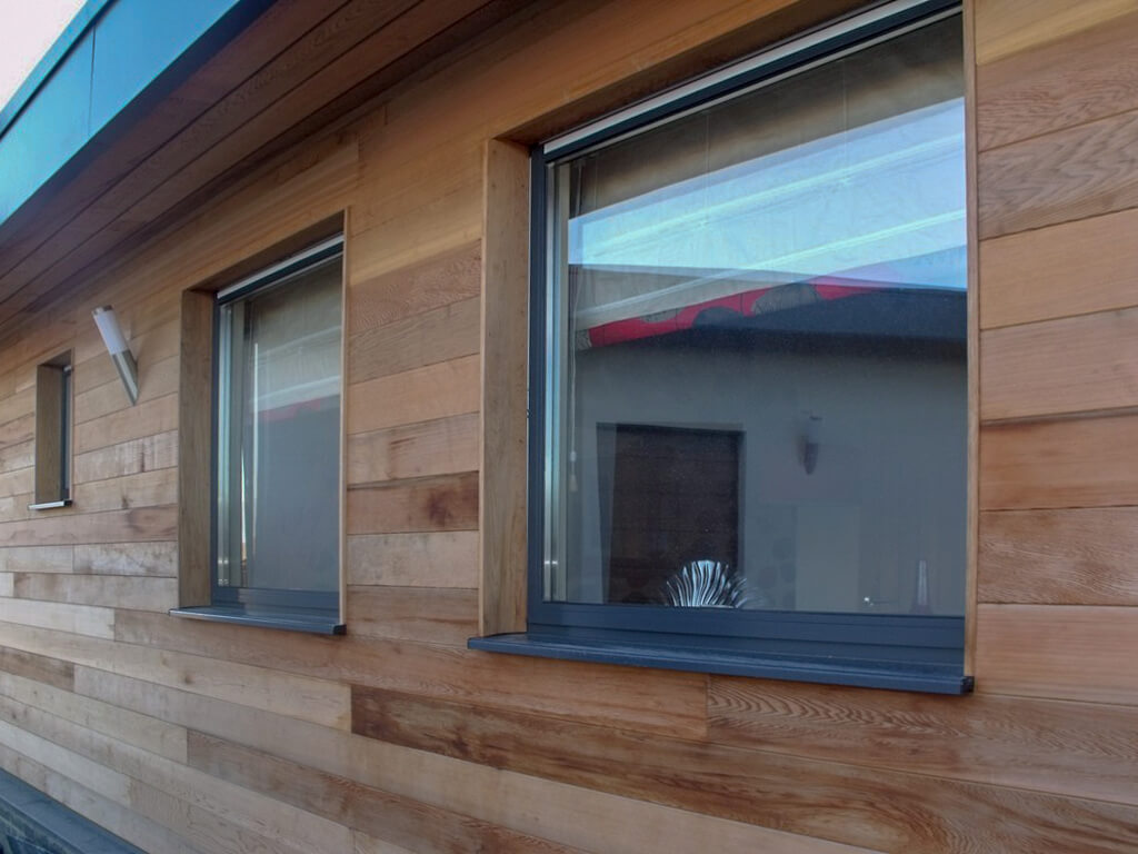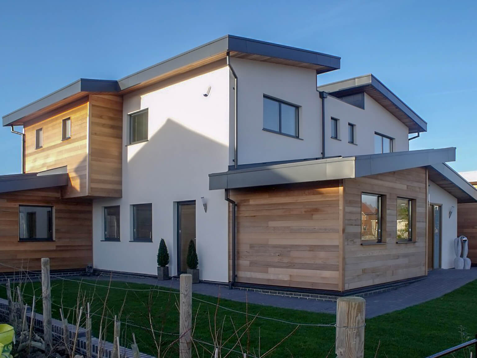 The design uses stacked geometric forms to define the structure, with generous glazing to maximise light and visual connection to the outside. Panels of vertical timber cladding contrast against rendered elevations, emphasising the architectural rhythm and material clarity. The integration of glazing and structural timber delivers both openness and thermal efficiency.